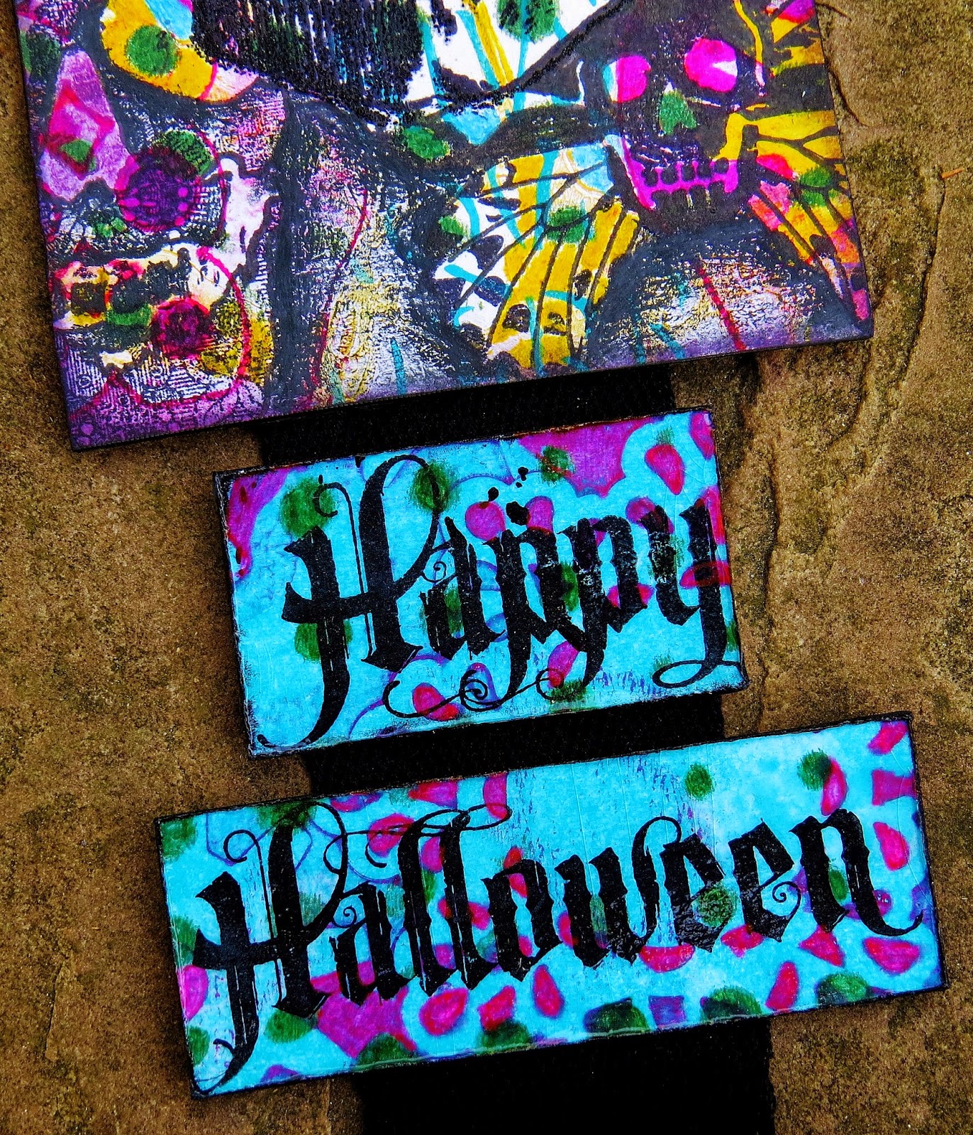 I LOVE making Halloween projects so this one came hot off the press or Gelli Plate actually. Well, to be honest, the gelli plate print was done ages ago and was made into a tag and then put away. I had the odd look at it hoping for inspiration but it never quite fit the ideas I was having, so away it went. Until now that is! I knew that it would work perfectly for a Halloween piece with lots of black and loads of random colours showing through stamped images.
