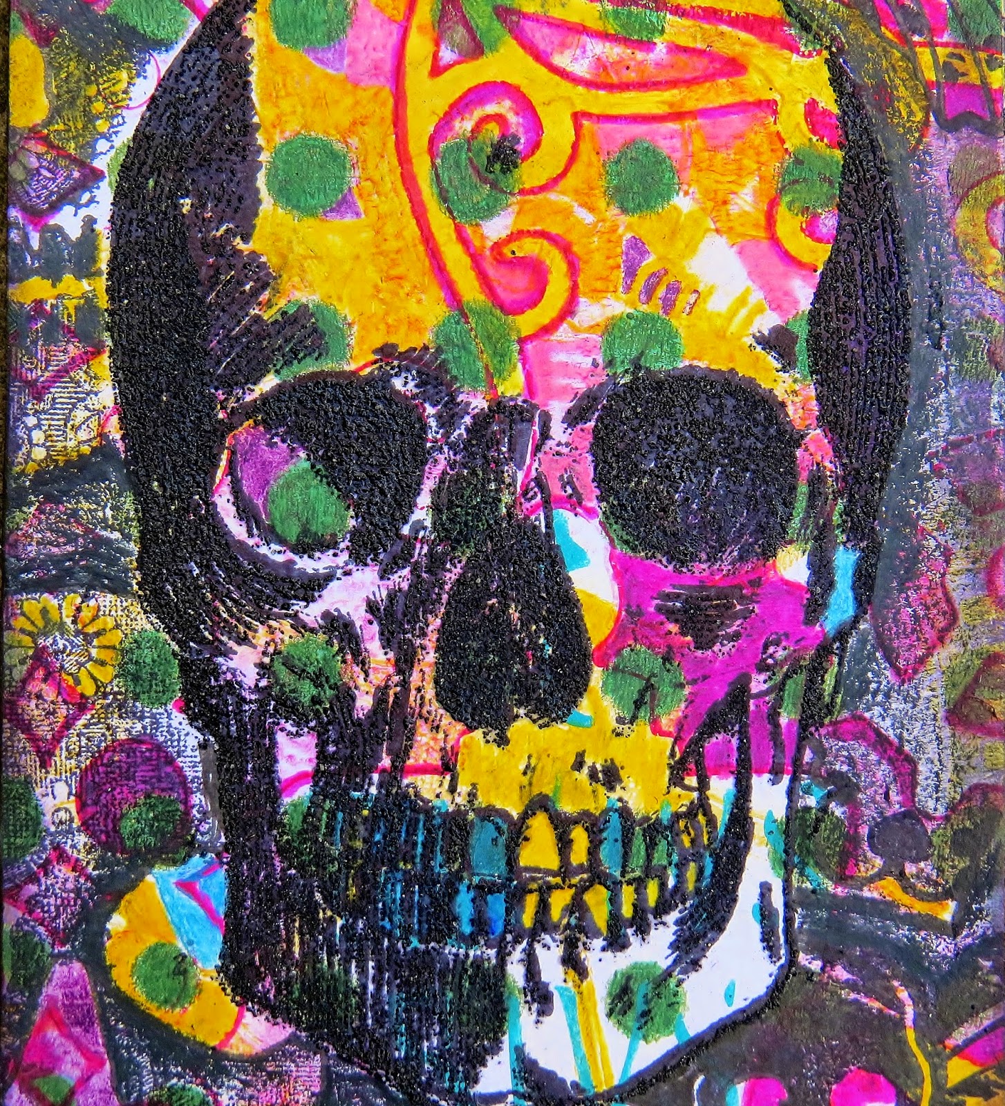 | The first step was to stamp the main skull image using a Tim Holtz stamp using black archival ink.Embossing ink was then used to stamp the image again in the same position. This was followed by black soot Distress EP which when heated creates a lovely textured appearance. I love that this image allows all the colours and stencil details of the gelli print to show through. |
