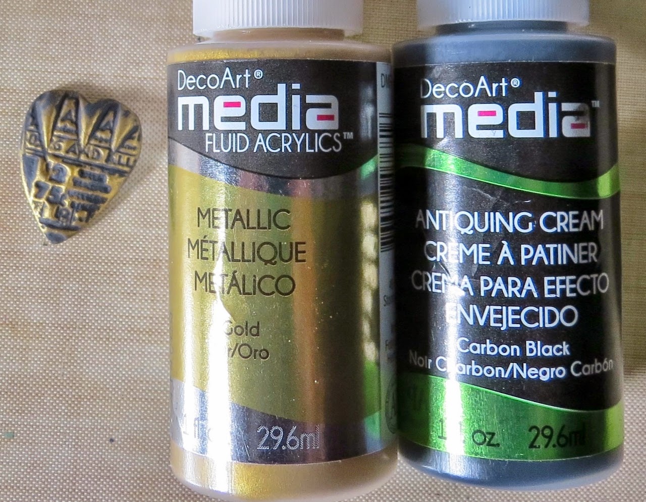 | A heart is made out of some Fimo clay and before baking, a stamp is carefully pressed into the clay to leave a decorative imprint. Once cooled, the heart is painted with the gold acrylic and antiqued with the cream - both are shown above. |