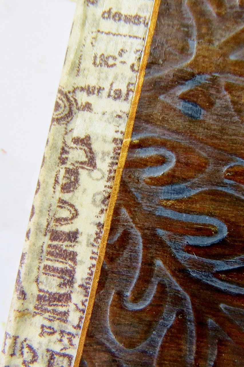 | Tone down each page by adding a thin coat of DecoArt Translucent white paint (not shown). Randomly stamp script images on pages with archival ink and use something circular to add rings as shown (I used a radiator key for this because it was just the right size!) |
