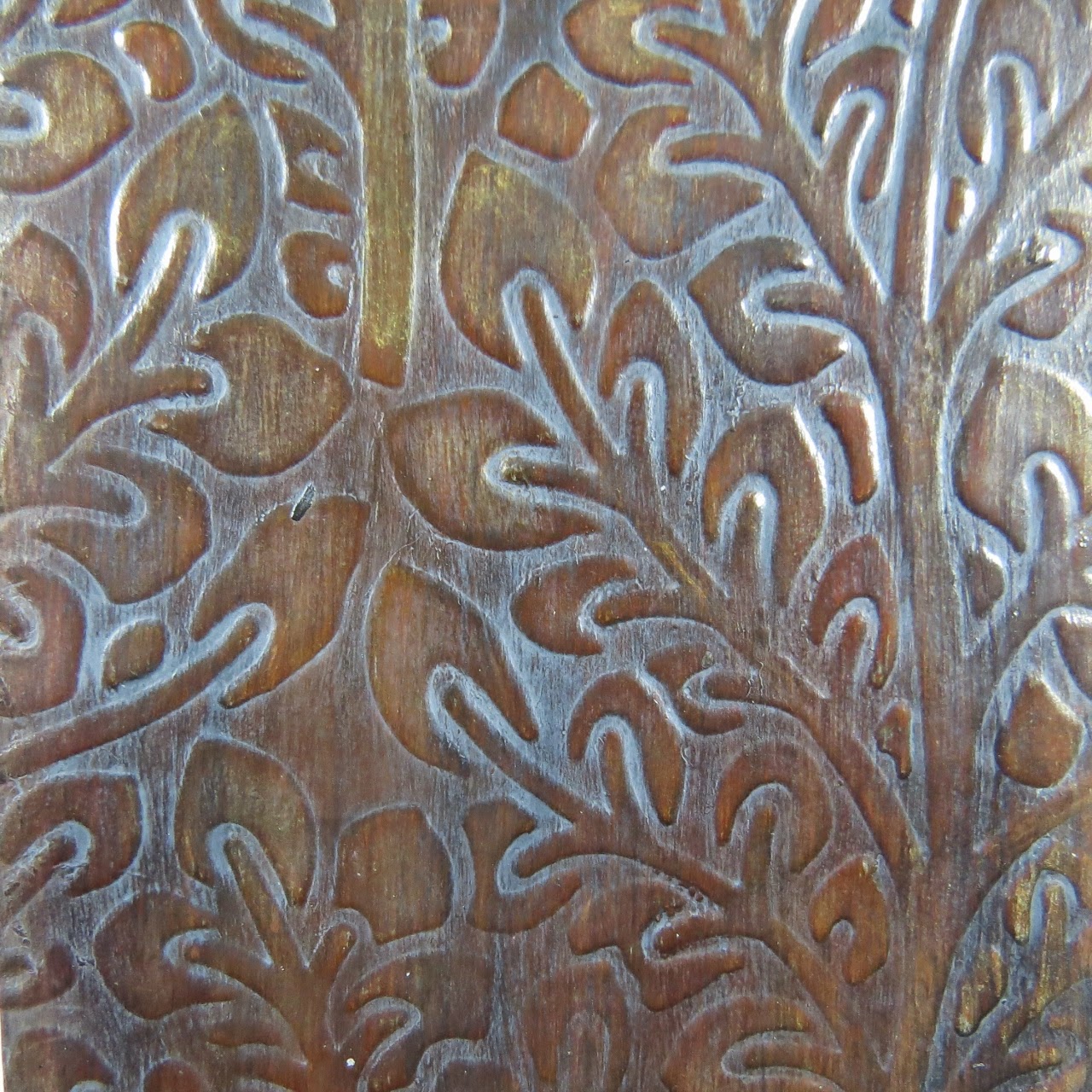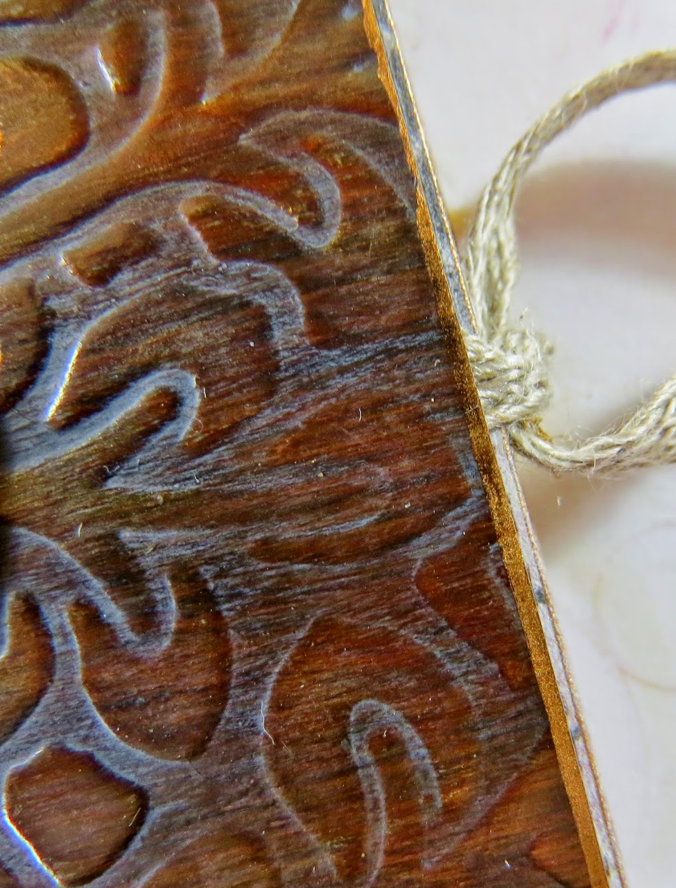 | I made this tag a while ago by embossing the card then applying many layers of paint to try to make it look like tooled leather. Up until now I hadn't found a use for it but I thought it would make a perfect cover for my little album. Here's a close up view to show the texture and colour tones: |