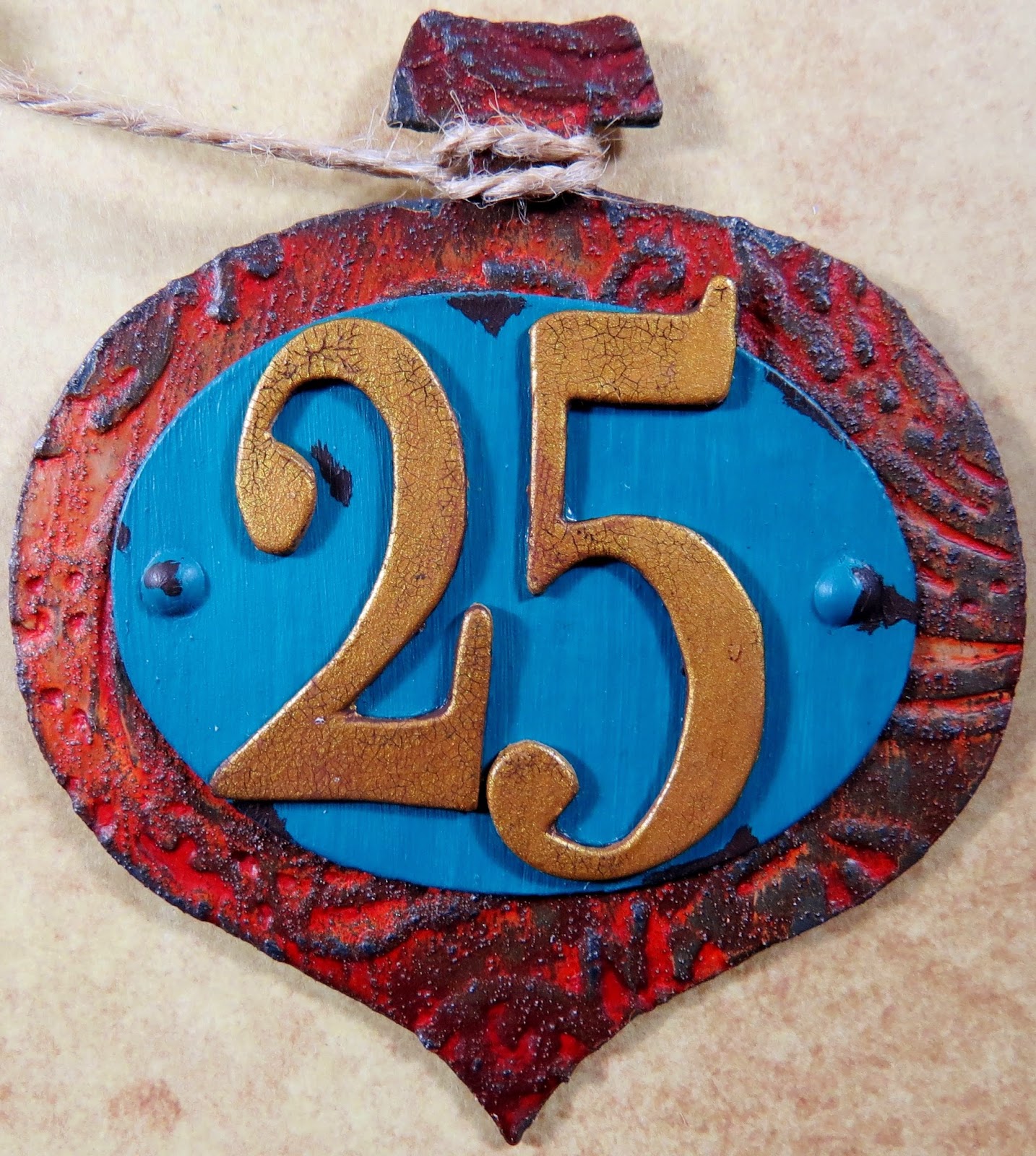 | The two tags shown here were folder embossed then finished with the acrylic colours shown followed by the antiquing cream. Crackle glaze is used on the numbers. More close ups follow to show the details. |
