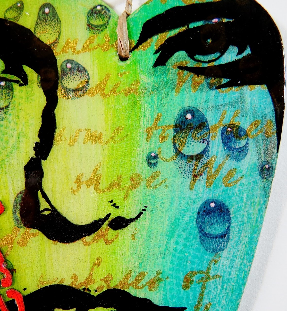 | The design is traced onto the heart using artists carbon paper. Black acrylic then fills the traced design. In this image you can clearly see the raindrop stamp with tiny little white paint highlighting dots. The stencilling sits under the stamping but is allowed to show through in some areas without any distractions. The flagstone stamp (in turquoise) is much paler in colour and this helps to build depth. |