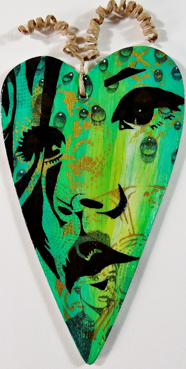 Here's what I made this time. I decided to use two pieces of my Daughter's art to alter a large wooden heart (