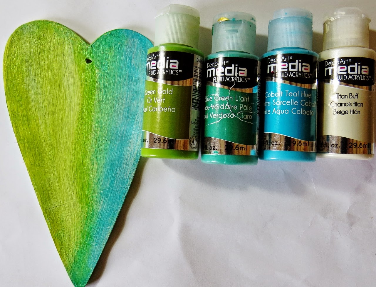 | Both sides of the heart are roughly coloured with the shades of acrylic shown. You can do this with a brush, sponge or your fingers. |