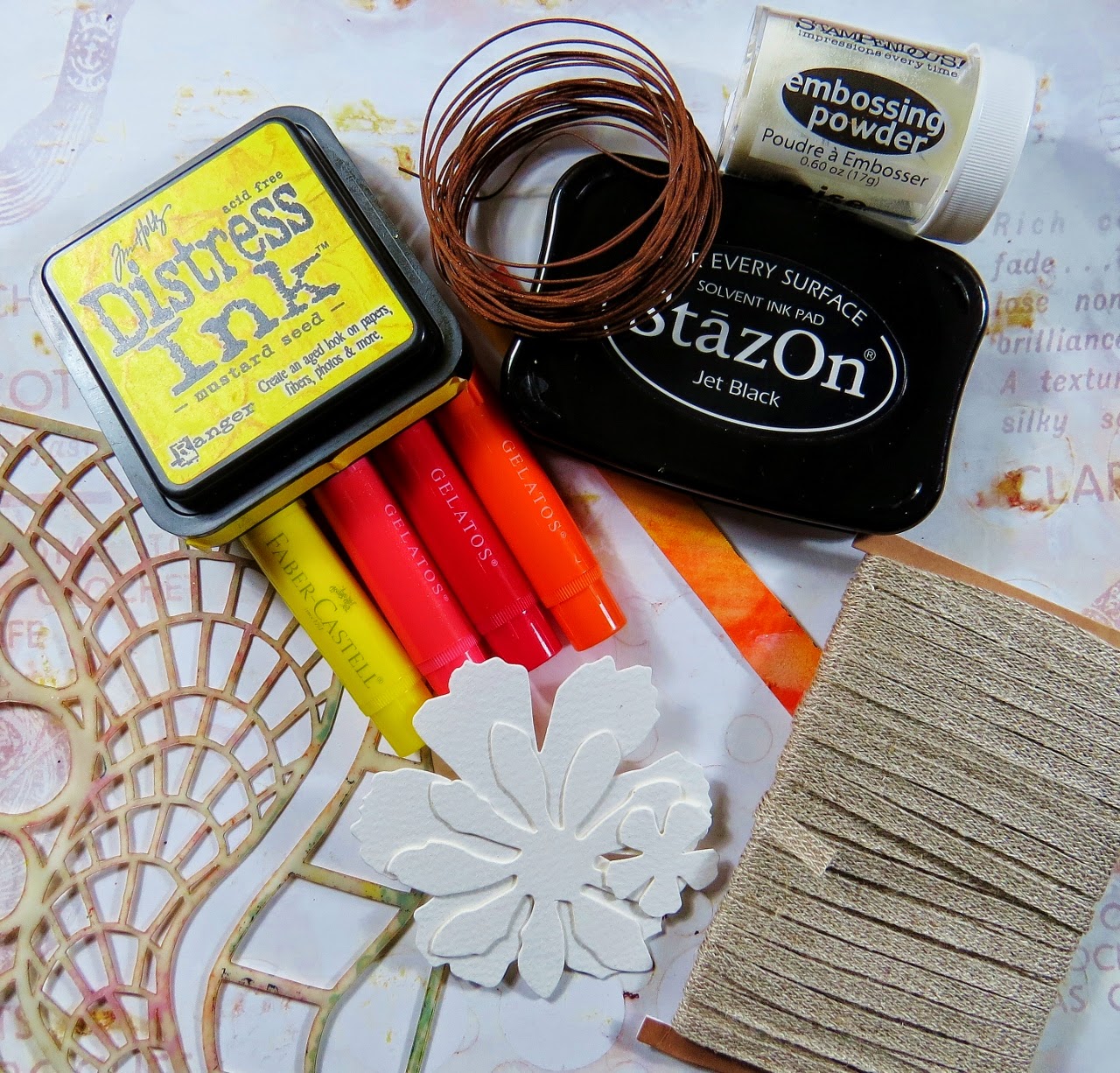 | Another piece of card was coloured using the same gelatos and some Tattered Florals were die cut. Some edges have been muddied with Distress ink and some gold mica spray was spritzed randomly on the finished flower. You can just see some curly rusty wire which I had to add - can't do without the stuff! |