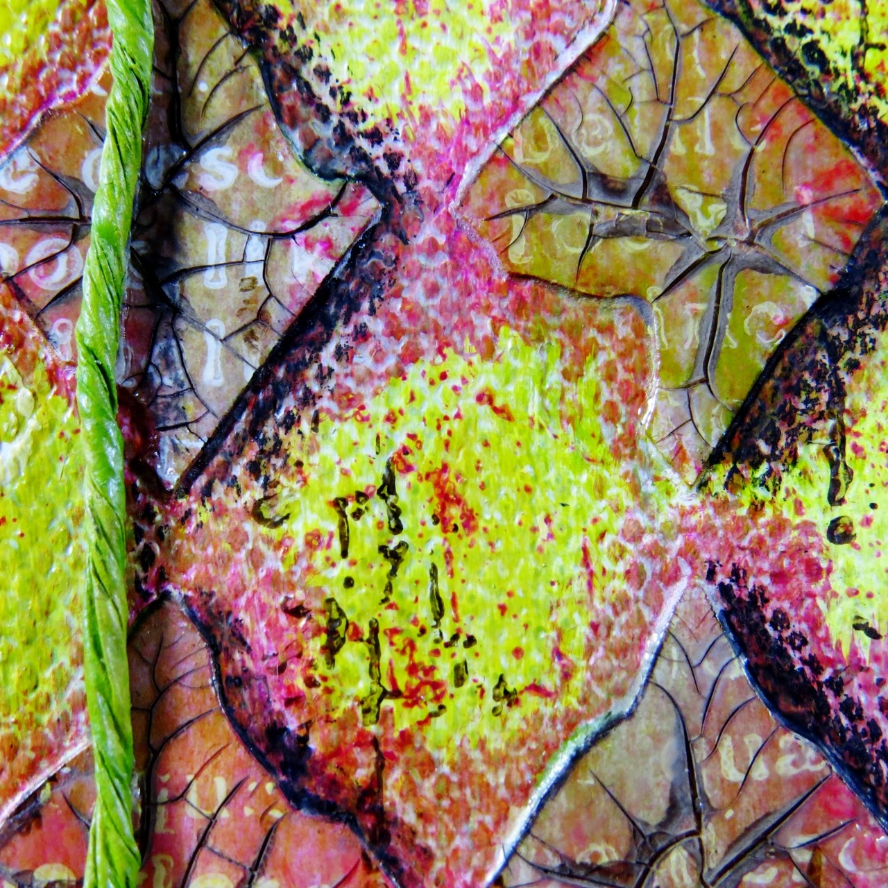 | The flower 'stalks' and 'roots' were made from wired paper string which has been coloured with the green gold fluid acrylic. The pieces were twisted together and the roots were made by curling the ends around a paint brush handle. |