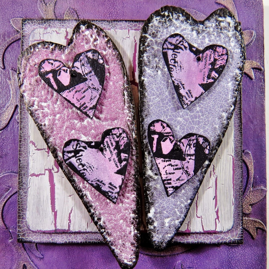 | Each heart is given a coat of crackle finish followed by some white paint to highlight the crackle. The hearts are sealed with matte medium then black acrylic paint is used around the edges to give definition. I wanted a modern, contemporary look for the hearts so this layer of black is made quite a bit chunkier than I usually would do. |