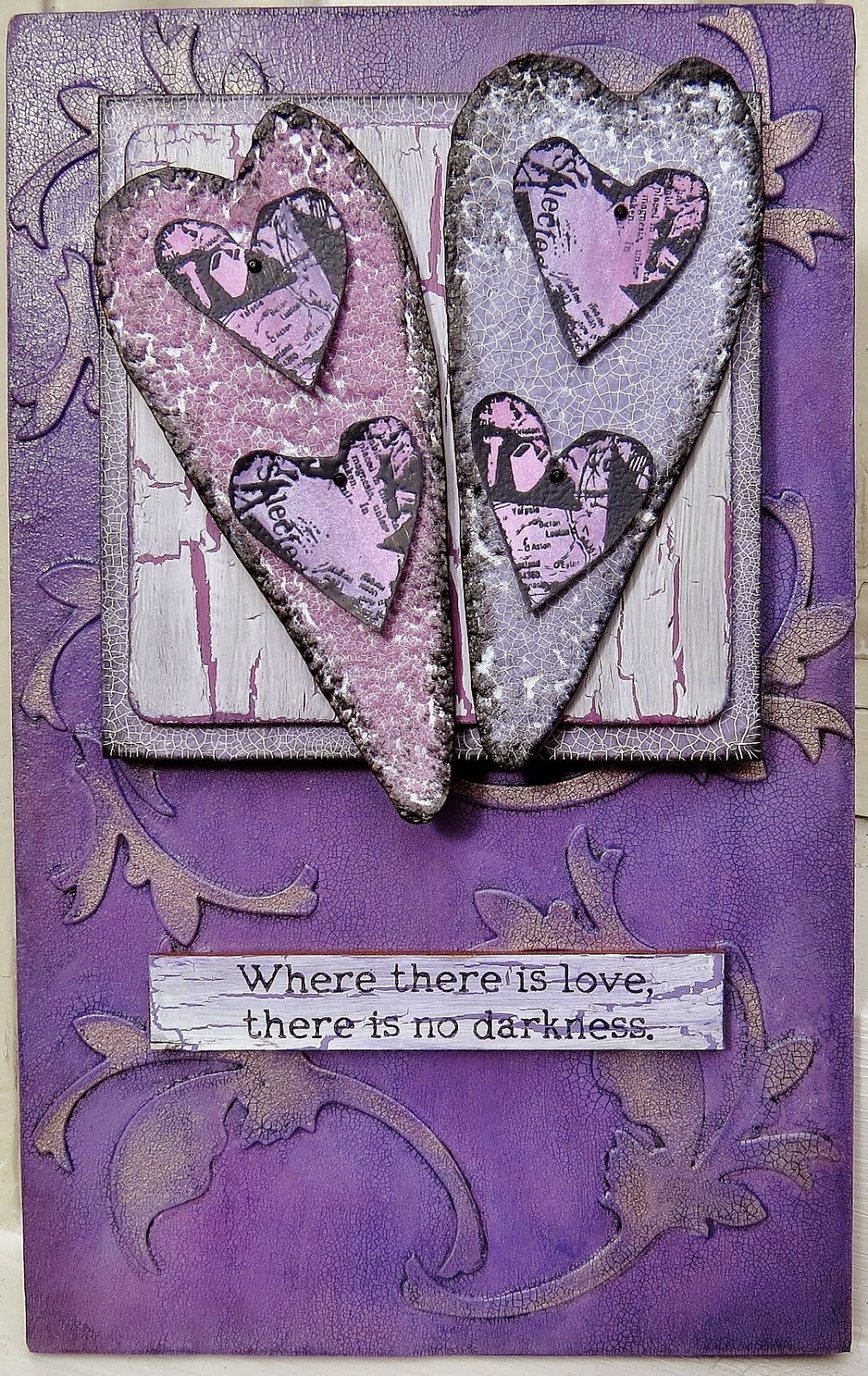| I wanted to make a feature of the two hearts so they have been attached to two other layers. The layer next to the foam board base is a chipboard Collage Frame. Originally I was going to use this for one heart but in the end used two. The frame is treated the same as the background except for the die cuts and it is also given some black acrylic paint on the edges for definition. The layer below the hearts is a Red Cross coaster which come through the door and which I can't bear to throw away! The coaster is painted with one shade of Fresco and when dry a medium is added to create a weathered wood appearance. Once dry, a coat of Snowflake Fresco is applied and the cracks magically appear. This is followed by matte medium and some black and eggplant Fresco to dirty it up a little. |