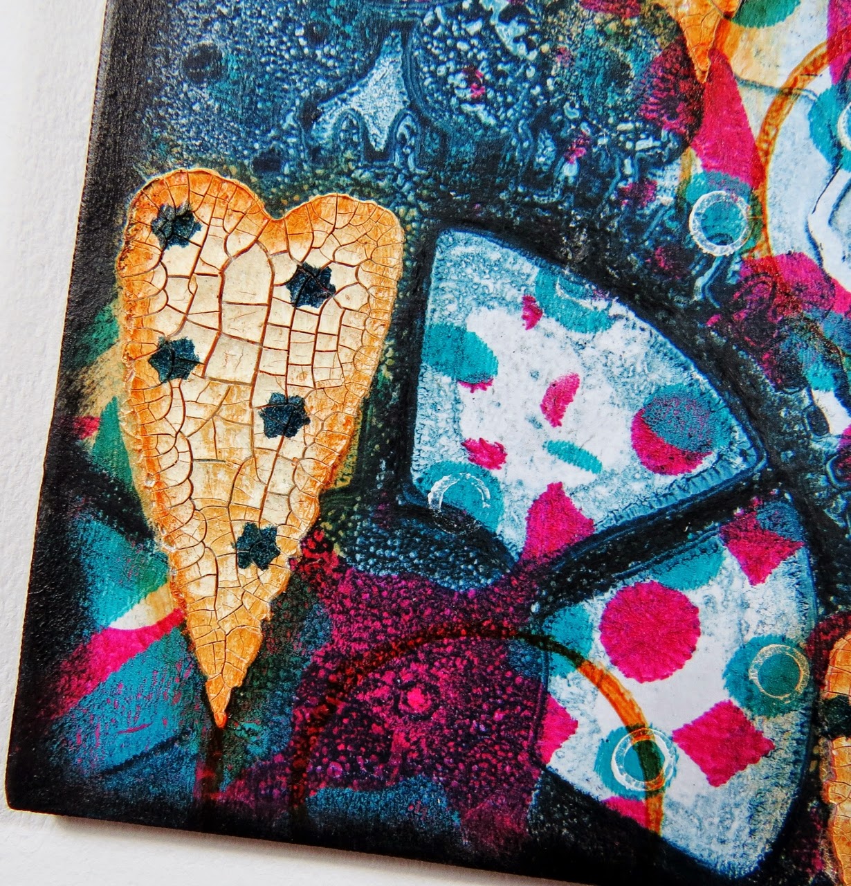 | All the hearts are stencilled onto the background using a DecoArt Crackle Paste. When dry, this is painted with Titan Buff Fluid Media Acrylic. Some of the letters are stencilled using this same colour. |