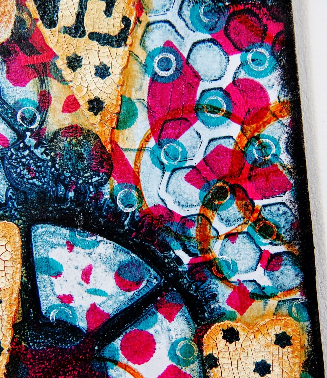 | The 'cup rings' have been stamped with Quin Gold paint as before. The little white circles are applied using a paintbrush protective tube and some Americana Chalky Paint from DecoArt. The other paint layers seen here are part of the original gelli plate print. |