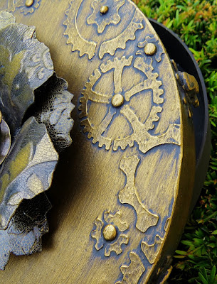 The sides have been embellished with die cut cogs, punched circles of card and some metal embellishments. All of this is then finished with the same paint and mediums as described previously.