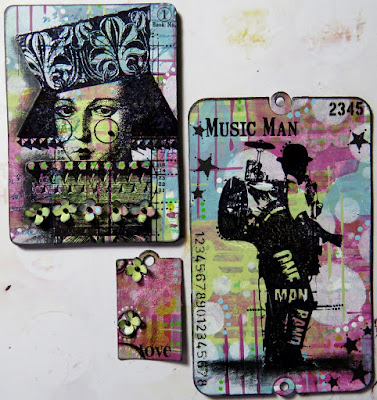 An unusual tag shape is die cut and stamped with this image from Stage Lights Plate 3. The technique used for the stamping is the same as the ATC.