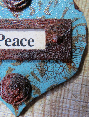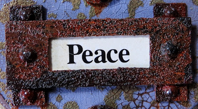 The rust method used sand texture paste, grey value 3, quinacridone gold and prussian blue fluid acrylics by DecoArt. The words are rub on letters used on card which is aged with Distress Ink.