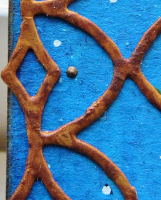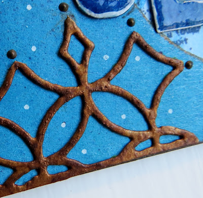 Sections of a die cut are coloured with the same acrylic glaze and applied to the torn card section in the top corner. The small brown dot is some liquid peals in a chocolate shade.
