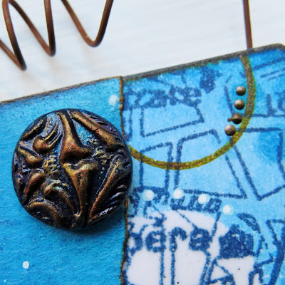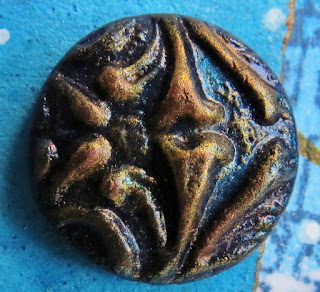 A home-made clay button is painted with DecoArt Media Line acrylics in prussian blue. The raised areas on the clay are brushed lightly with the same acrylic glaze used previously.