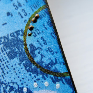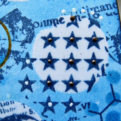 This image shows one of the embossed circles. Liquid pearls were added to some stars and a white pen to others. In the right hand corner you can see some stencilling done with the same distress ink colour used for the background.