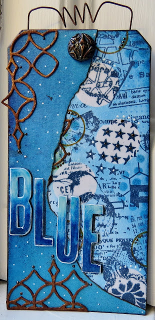 A piece of card is coloured using DecoArt Misters in two shades of blue plus white. To mix the colours, the wet paint is misted with water and left to dry. A piece is torn off to fit the tag.
