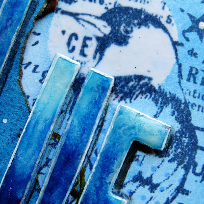 The letters are die cut from scrap packaging for extra thickness. They are coloured with the same acrylic misters as before but heavier with the white shade and lots of spritzed water is added. I love how the bird's head is picked out in the clear embossed circle.