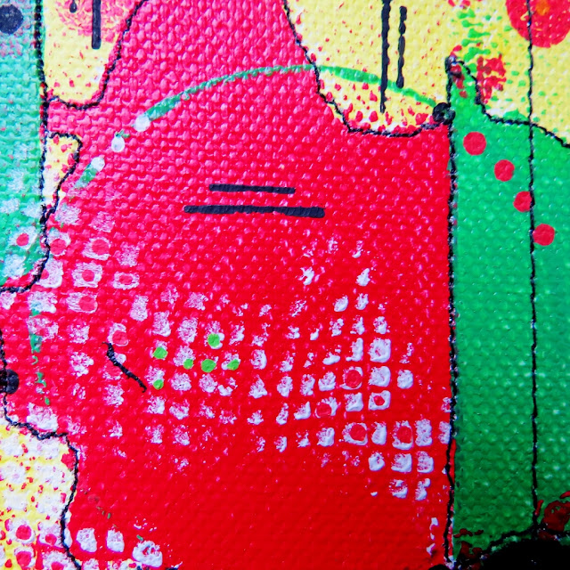 A close up to show the stitching and the paint application which wasn't quite as time consuming as it looks! The texture of the canvas is visible through the layer of gesso which seals it.