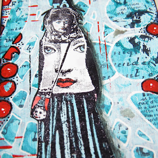 HERE.To get myself started again, I decided to have a little play with a Tando media board and some paints and stamps. All paints are DecoArt and the stamps are by Teesha Moore and Carabelle. Various stencils have been used along with pens, pencil and Liquid Glass by DecoArt.