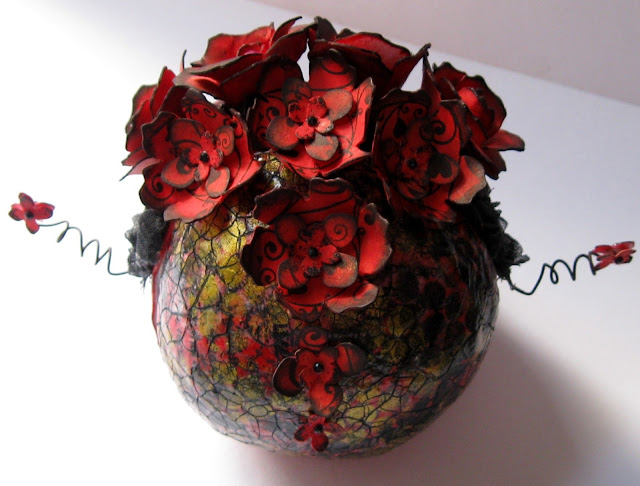 | My skull tea light holder. I've chosen to use traditional Valentine colours red and black because I felt they fitted my chosen theme perfectly.I haven't added any words but there are stamped hearts on the flowers if you look for them. |
