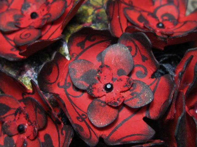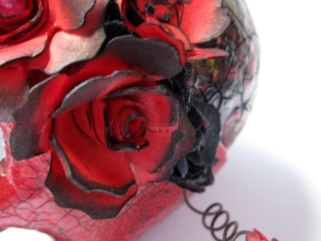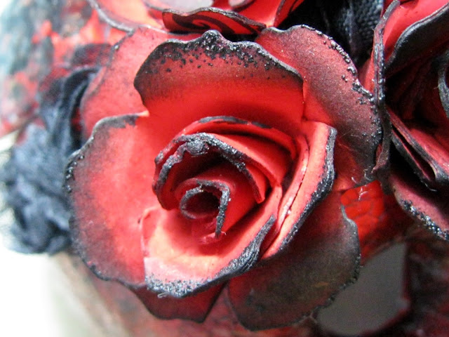 | For the front of the skull, I made a headband out of wire, rose trim (thanks to my lovely blog friend Trace for this!) stained black and die cut roses. The roses were coloured red, constructed and the edges were inked and some black distress EP was used randonmly for interest. |