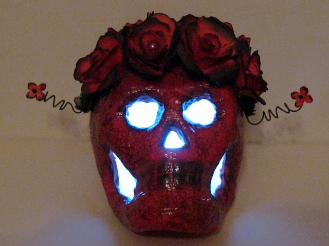 | Side view of the holder. You can see where the skull has been opened to allow access for the tea light. I made a hinge from paper fasteners and wire under the flowers and this helps to keep the skull 'flap' in position. |