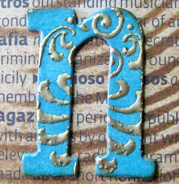 | The letters were die cut from packaging and coloured with the same distress colour used previously. The corner stamp was then randomly applied to each letter using versamark followed by gold EP. To complete the letters, a coat of glossy accents was applied - for once you can't see this in the photo. (It usually just shines and ruins every image!). |
