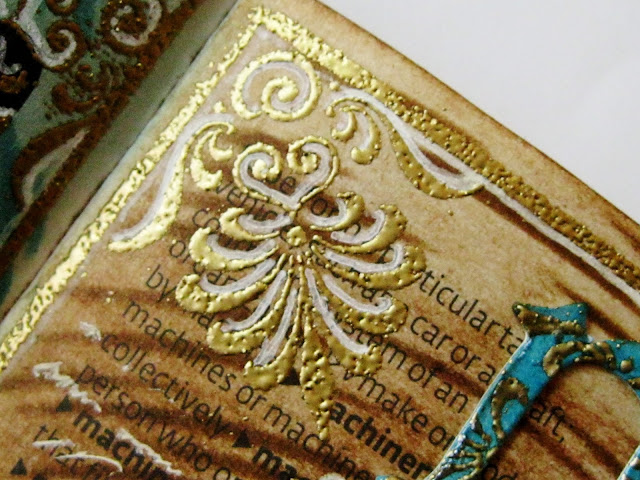 | The facing page with the definition was completed using distress ink nearest in tone to coffee archival. Corner stamps were the same and a border was applied to both pages using a versamark pen and gold EP. The same stencil was used. |