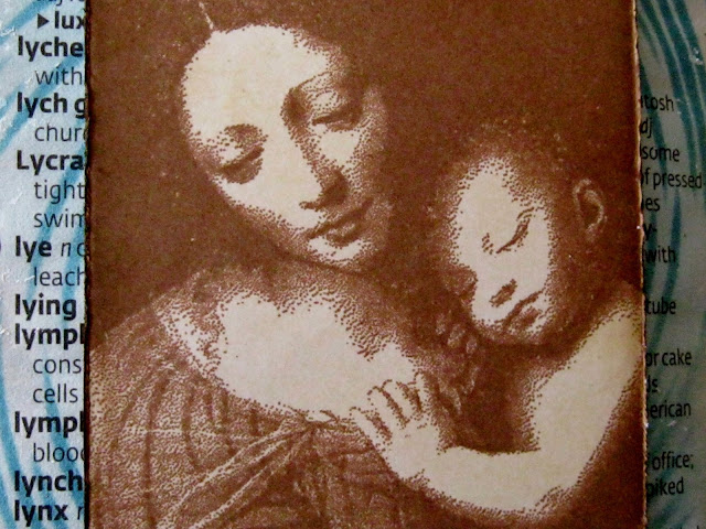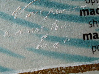 | The paper in my dictionary is very 'furry' as you can see from this image! For my background I used a new Andy Skinner stencil over the pages which had been sponged with distress ink. The same shade was used through the stencil. Fresco paint was used to randomly stamp text around the background. (I love the fact that these are matt. . . . more wish list items!). |