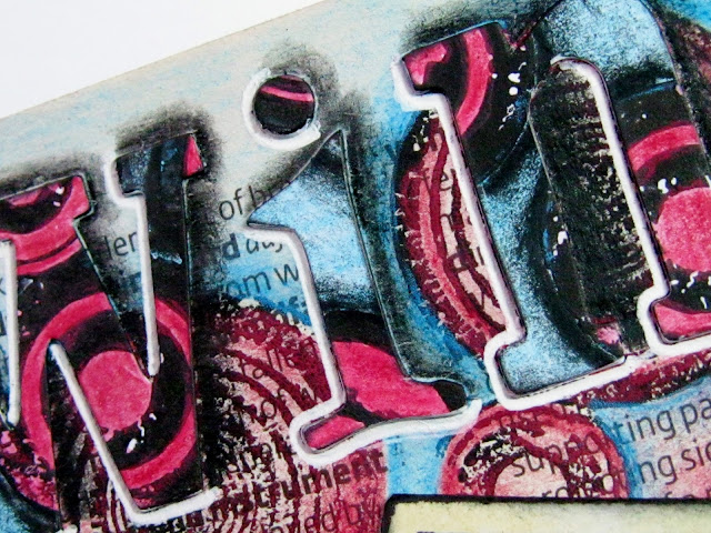 | The letters are die cut from card with a background created in the same way as the main pages although a waterbrush has been used to give a varied effect to the colour. Once applied, each letter has been shaded with black pencil and partially outlined with white gel pen. |