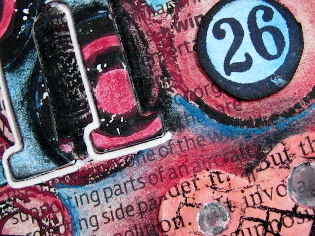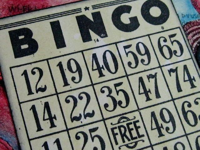 The letter for this fortnight is W and I have chosen the word 'Win'. We are asked to include one other element in our background and that is to use circles. I've based my pages on the game of Bingo because the 'circle' requirement echoes the number balls used in this game. I've also used a fairly retro circle stamp for my background because that's how I view the game of Bingo!