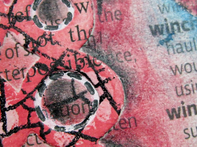 | The die cut washer strip is cut from book text, a thin layer of gesso applied and a final coat of distress ink. |