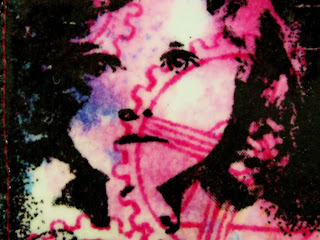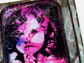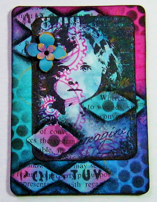 The same little girl and cog background. Some script stamping with versamark and gold mica adds interest.