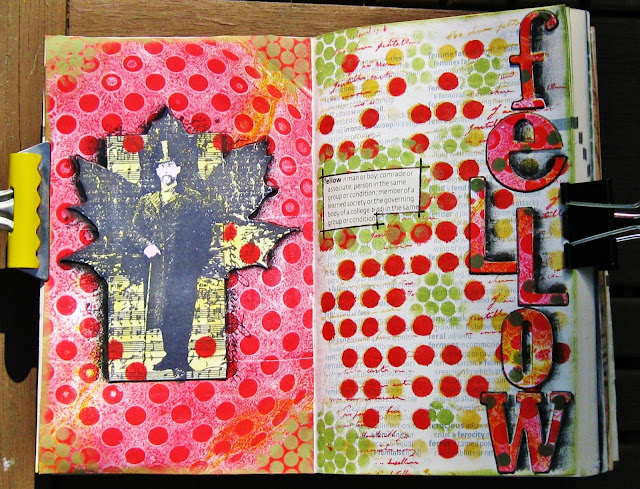 | The left page was made with part of a gelli plate. The right page was made using stencils and stamping. Both archival inks and DecoArt Traditions and Americana paints were used. |