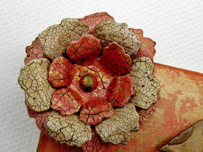 To make the flowers (follow images from left to right), I painted card with the same colours used on the base - I've only shown two here as the rest were already cut up! Flower shapes were die cut. Each die cut was stamped with a script image and versamark. Gold mica powder was then applied. DecoArt Two Step Crackle medium was then applied according to the instructions. Raw umber Traditions paint was applied to the crackle when dry and wiped back with a baby wipe leaving the colour only in the crevices. The flowers were then assembled in various combinations of shape, size and colour. |