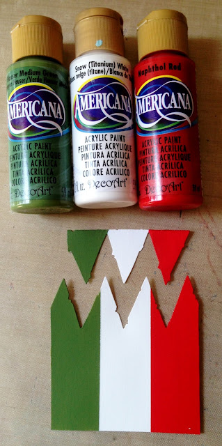 | A pocket was cut using an On The Edge die and some of the waste was saved. Both layers were masked and painted with DecoArt Americana acrylicsin the colours of the Italian flag. |