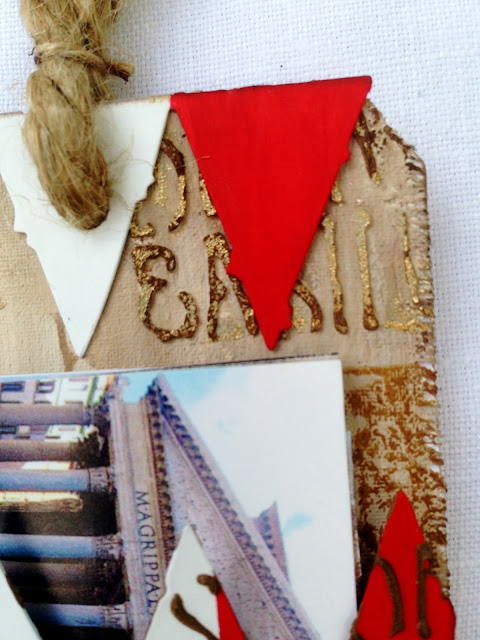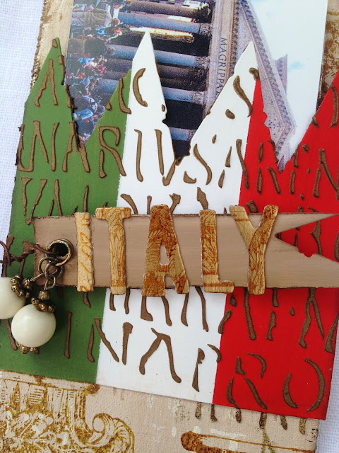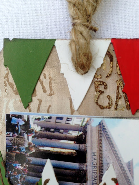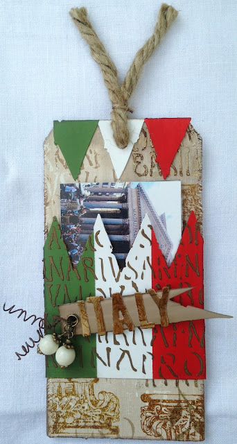 Italy. We have a really free hand to interpret the challenge in any way we please so I decided to make my tag background inspired by the colours of the many historic marble, stone and painted treasures I saw last year in Rome. I wanted to make a little pocket on the tag for some of the many, many photos I took.