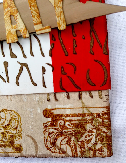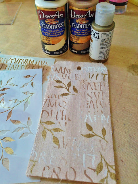| Some DecoArt Modelling paste was mixed with DecoArt Traditions and Golden iridescent bronze. The mix was used through the script stencil used earlier. In real life, the modelling paste has a lovely golden brown hue. |