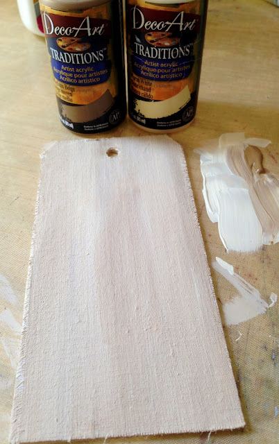 | A calico tag shape and another in thick card were cut and glued together. The calico layer was coated with DecoArt gesso and dried. |