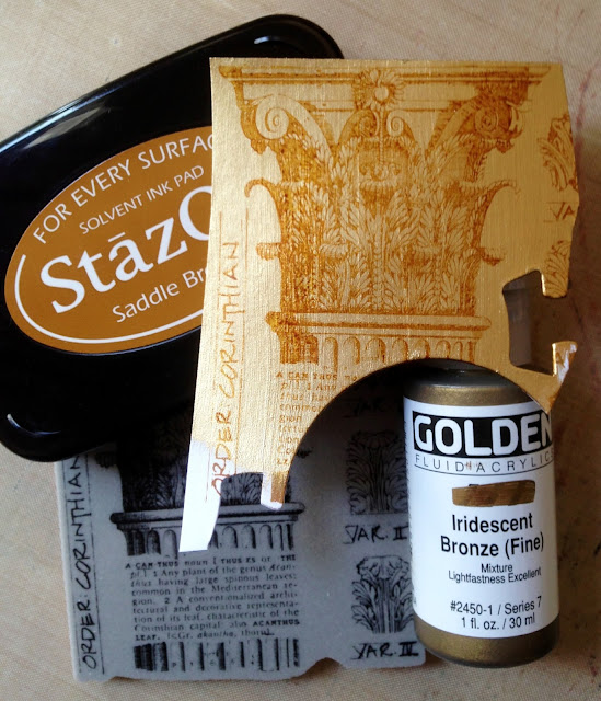 | Scrap card was painted with the iridescent bronze, dried, then stamped with stazon using a Tim Holtz architectural stamp. |
