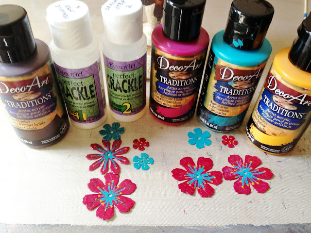 | Flowers have been used to decorate the project in various places. Floral shapes were die cut, painted in the same colours as the body and details were added to some of the flower centres. Two step crackle was applied as before on the wings and base/stand. |