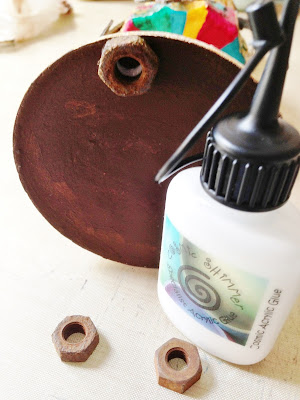 | The base was painted with DecoArt Traditions. Three old nuts (naturally rusted), were glued into position to act as 'feet' to raise the stand up a little. |