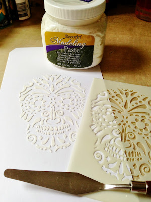 | A stencil (byAndy Skinner) and some modelling paste start to add texture to the tag surface. |