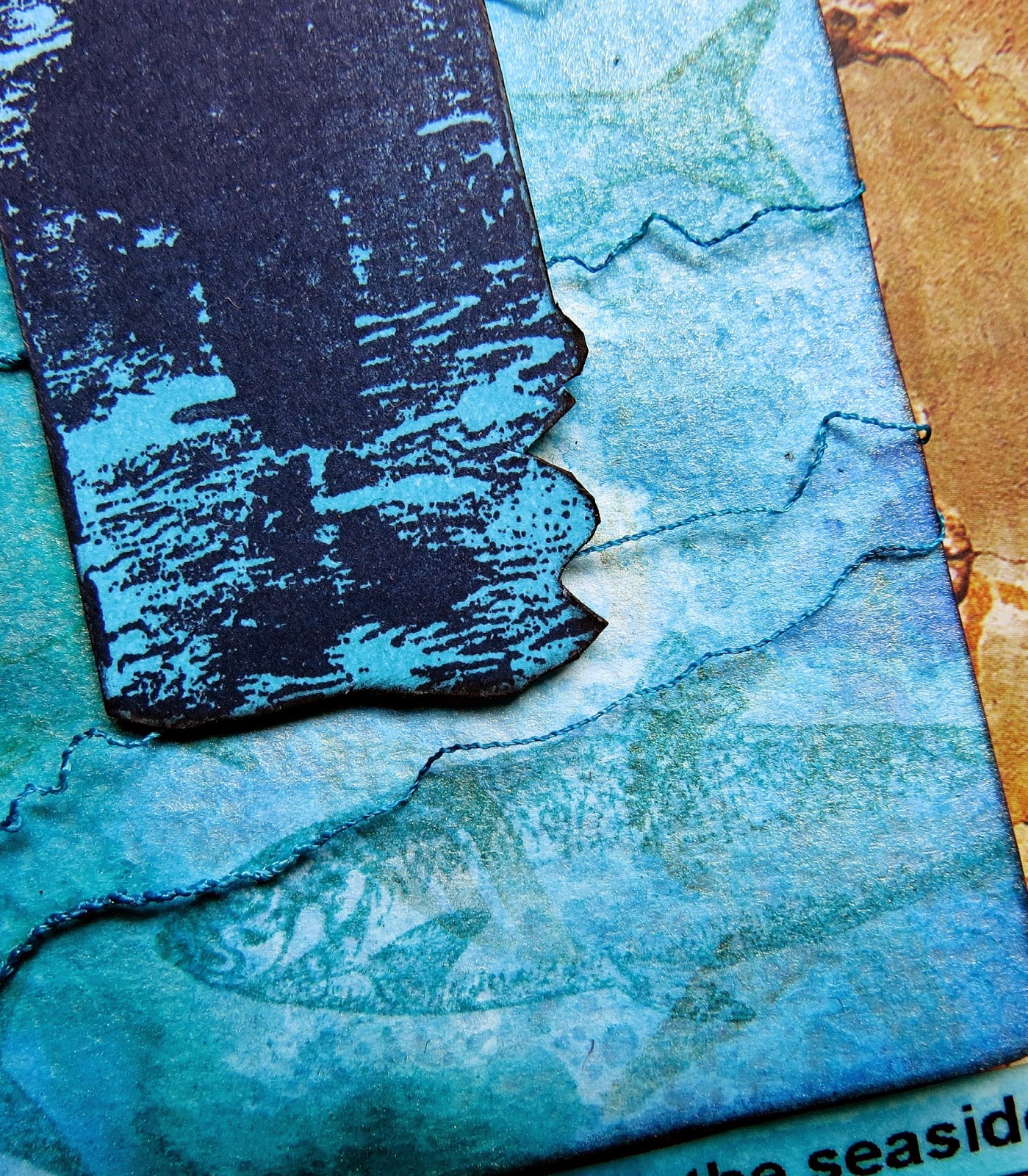 | The fine textured yarn was coloured with the remains of the Dylusions spray from the craft mat. I included the yarn to convey the idea of waves and motion. |