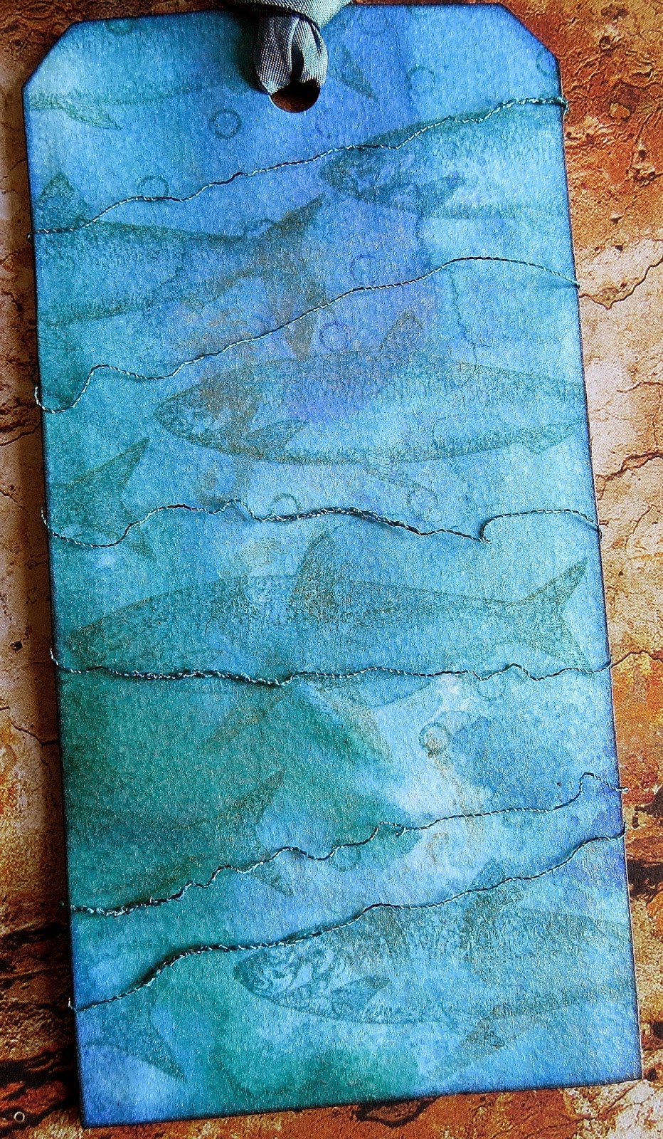 | The base of the tag is watercolour paper which was coloured with Dylusion ink sprays and Perfect Pearls spray. Images were then stamped using a variety of distress ink colours. Each fish was then enhanced using a watercolour pencil but no water. I love these pencils because they give such rich tones to the work - wet or dry. |