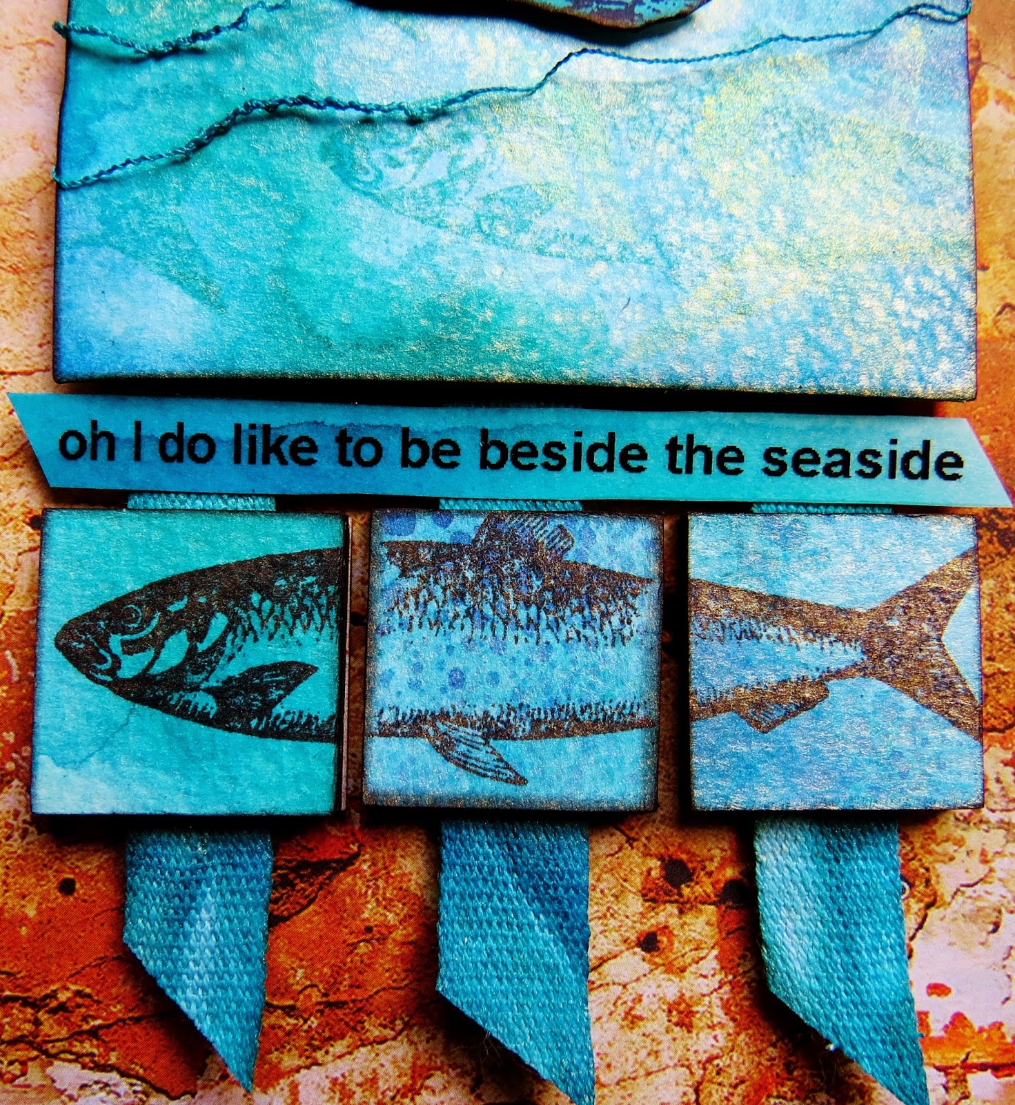 | The fish at the bottom was stamped onto some scraps of the watercolour paper coloured with the Dylusion inks. The paper was stuck onto some Tando inchies and then they were laid close together on the craft mat. Once in position, the fish was stamped onto the inchies. |