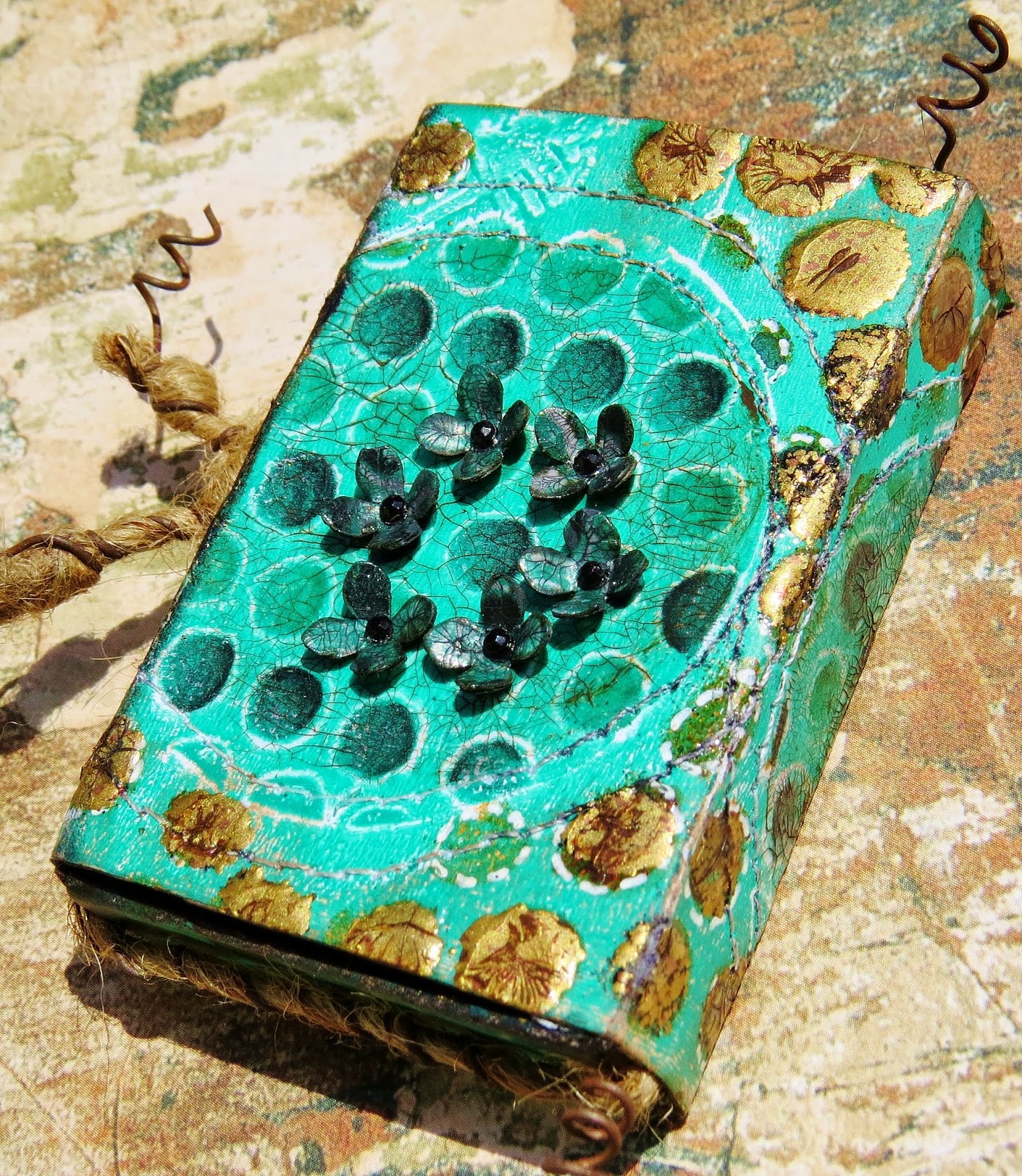 | The mono print can clearly be seen here in the background. The circles were altered using either a black pencil or someDecoArt Media range Quinacridone Gold paint. Machine stitching was added around the larger circles. Finally a coat ofDecoArt Crackle Glazeto finish. The tiny flowers are punched from scraps of the print, crackle glazed then rubbed with carbon black paint. Tiny black gems complete the flowers. |